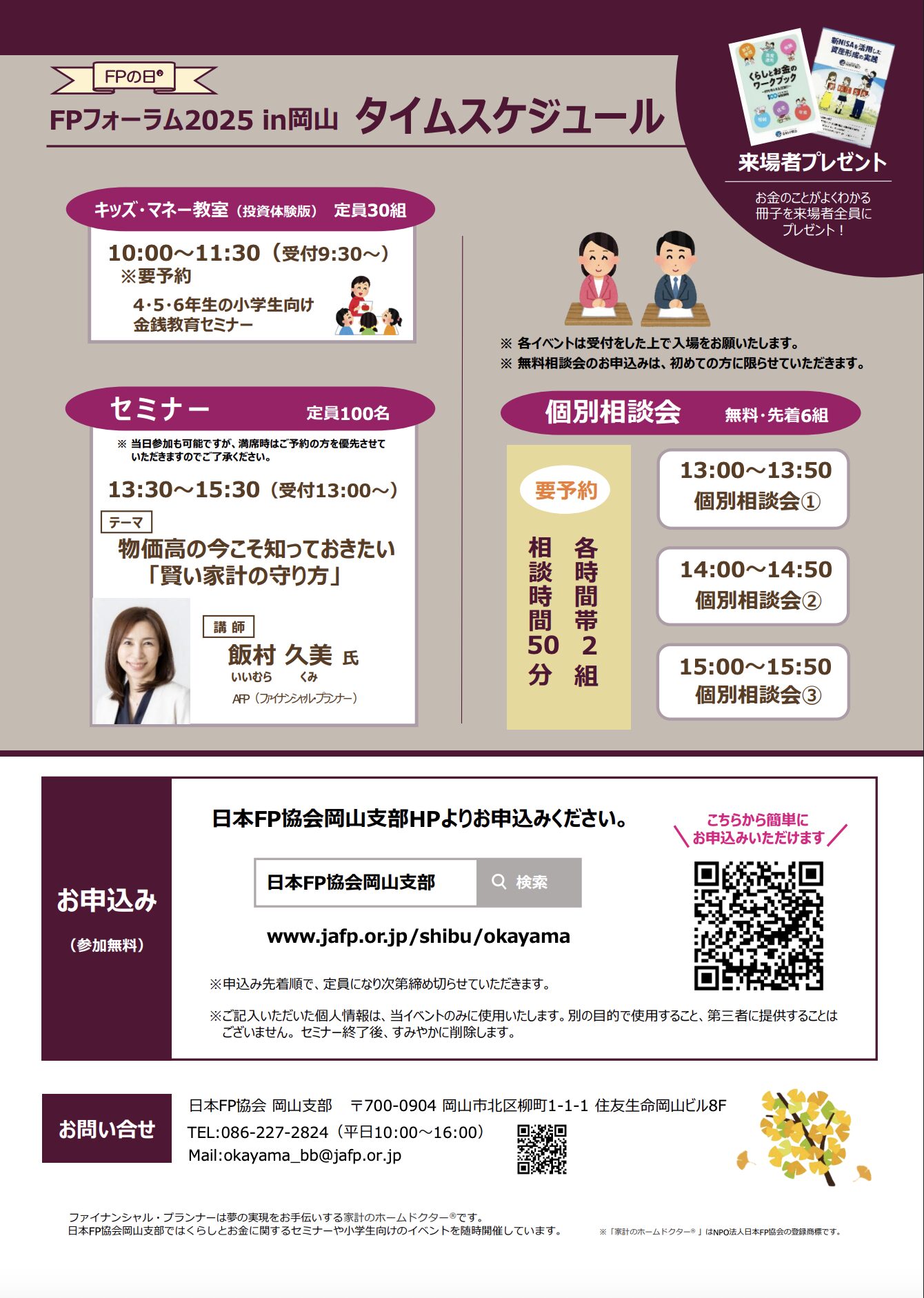 参加無料。申込み先着順で、定員になり次第締め切りになります。日本FP協会岡山支部HPからお申し込みいただけます。ぜひお申し込みください。
